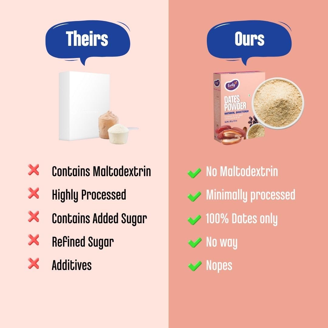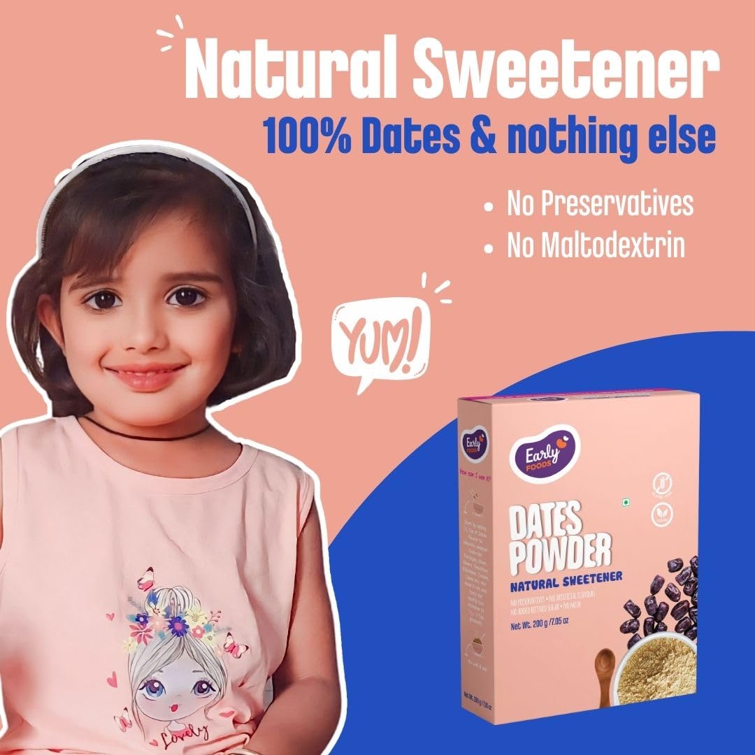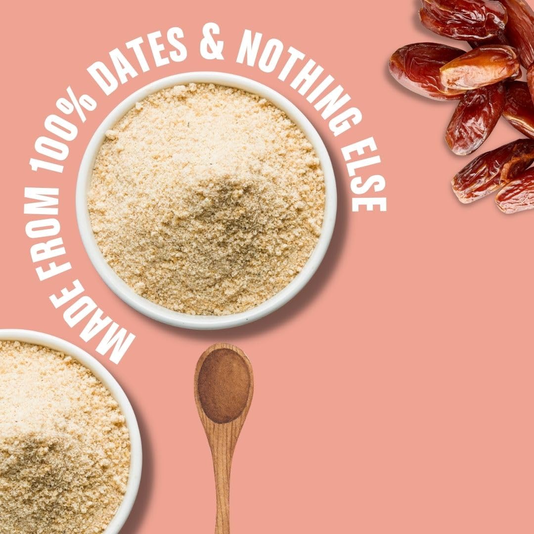 – Its 100% Dried Dates in the form of a fine powdered date sugar. An excellent substitute for sugar for giving sweetness to food.