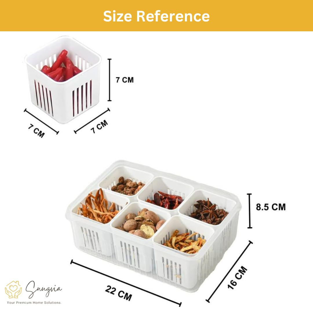 Fridge Storage Container: 6.3×9.25×3.25inchDetachable Small Boxes: 2.87×2.76×2.83inchThe drain compartment keeps the flavor, the drain compartment in the box can drain water quickly and prolong the preservation time.There are 4 or 6 inner boxes of the same size, which are very suitable for keeping your favorite foods fresh and safe. They can be placed in the refrigerator to save space and avoid cross infection.